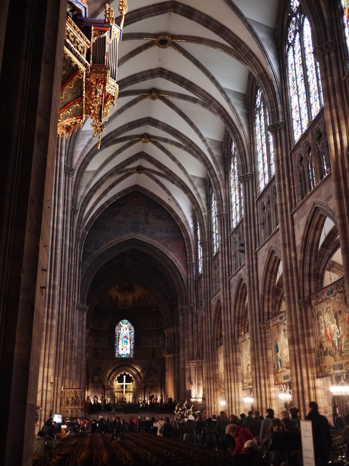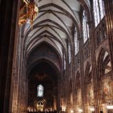 A l’intérieur de la cathédrale, la lumière des vitraux médiévaux, miraculeusement préservés durant les guerres, répond au son de l’horloge astronomique et des orgues. En tendant l’oreille, peut-être entendrez-vous le prêcheur vous parler du haut de la chaire, véritable dentelle de pierre. A moins que vous n’entendiez que les ronflements de son chien, préservé dans la pierre sur le côté du monument ?