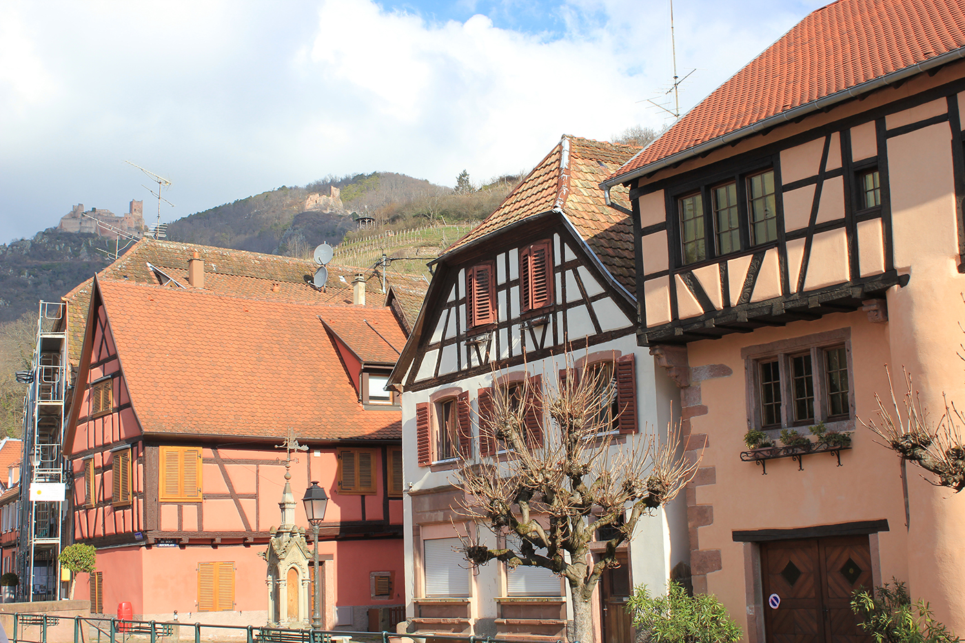Petite ville nichée au cœur des coteaux, Ribeauvillé s’étend le long d’une rue principale pentue.